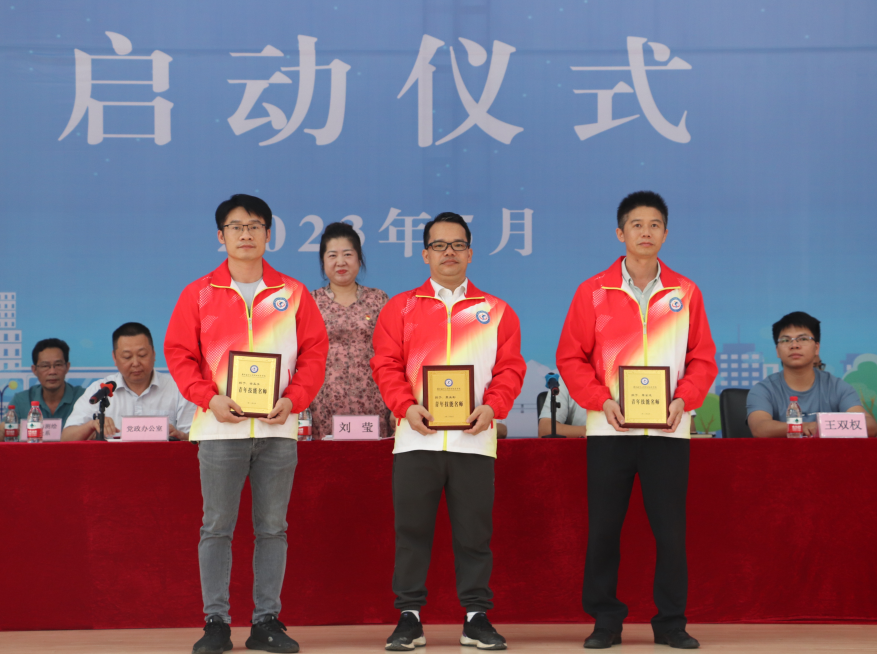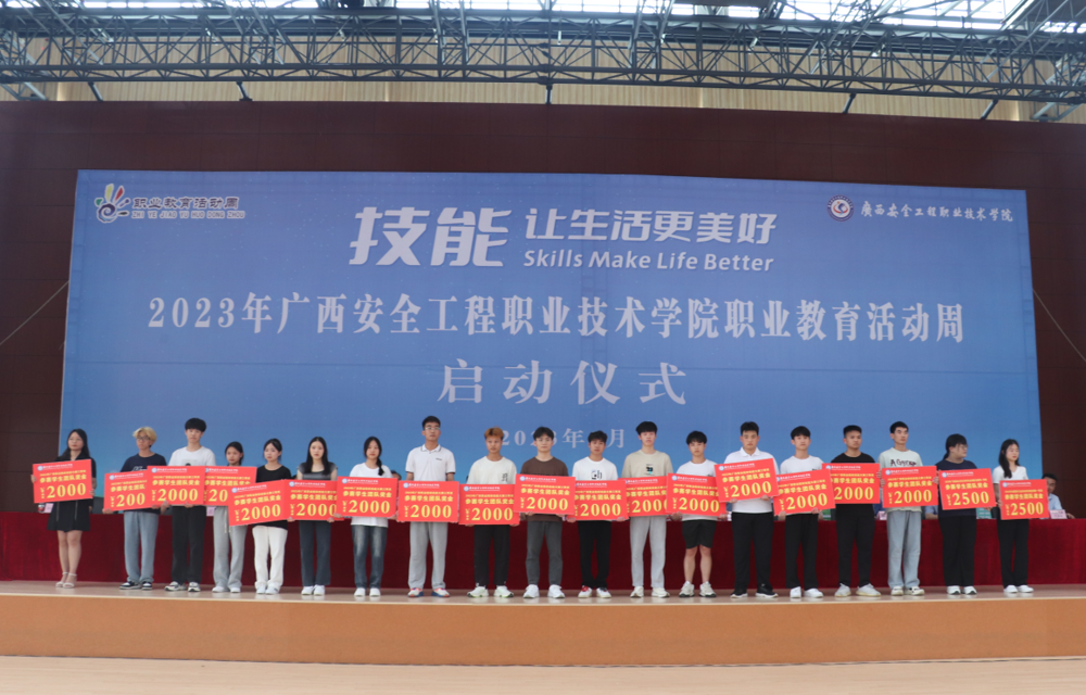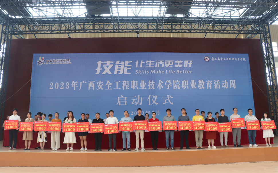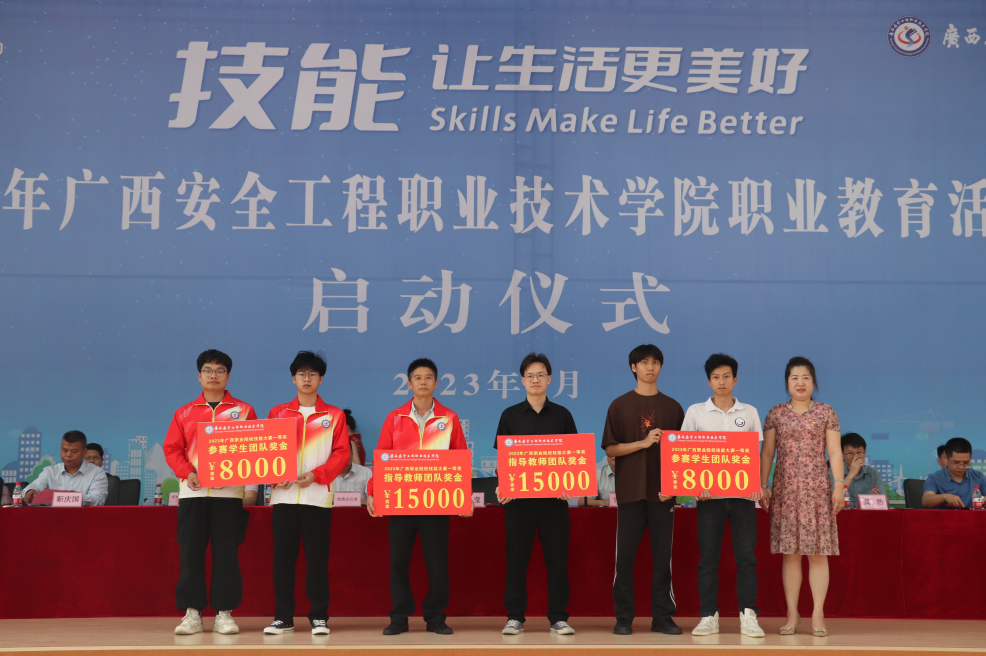 启动仪式上,学院领导、企业代表分别为覃金龙、覃业彬、梁孟享等三位教师颁发青年技能名师聘书,为获得2023年全区技能大赛一、二、三等奖及学科竞赛一等奖的师生代表颁奖。