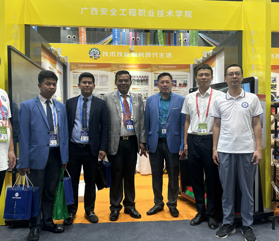 老挝甘蒙省职业技术学院来宾到我院展位体验虚拟仿真灭火