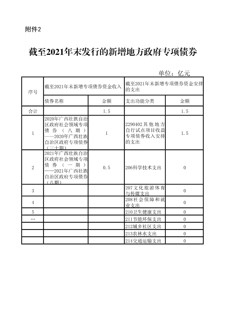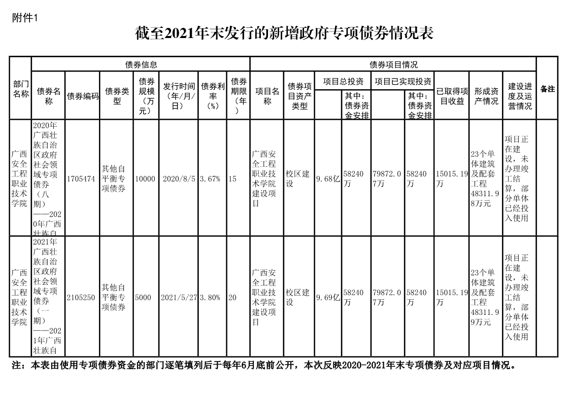 2020—2021 年发行且在存续期内的新增政府债券信息公开 来源: 发布时间:2022-06-29 21:28:54 浏览次数: 次 【字体:小 大】 根据《财政部关于印发〈地方政府债务信息公开办法(试行)〉 的通知》(财预〔2018〕209 号)、《财政部办公厅关于印发地方政府债务信息公开参考表样的通知》(财办预〔2019〕33 号) 和《广西壮族自治区财政厅关于印发广西政府债务信息公开实施 细则的通知》(桂财规〔2019〕1 号)等有关要求,为做好学院新增政府债券存续期内信息公开工作,现将2020—2021 年发行且在存续期内的新增政府债券信息公开公开如下: 分享到: 打印文章