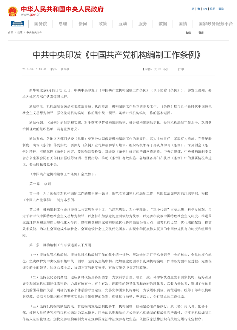 中共中央印发《中国共产党机构编制工作条例》_(转载中国政府网)